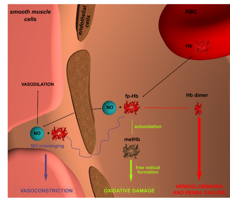 Outside the red blood cells, the iron contained in hemoglobin within a cofactor called heme is oxidized (oxyhemoglobin, oxyHb becomes methemoglobin, metHb), can then be released into the plasma and promote phenomena such as lipid peroxidation, damage to DNA and proteins, thus causing oxidative damage.
